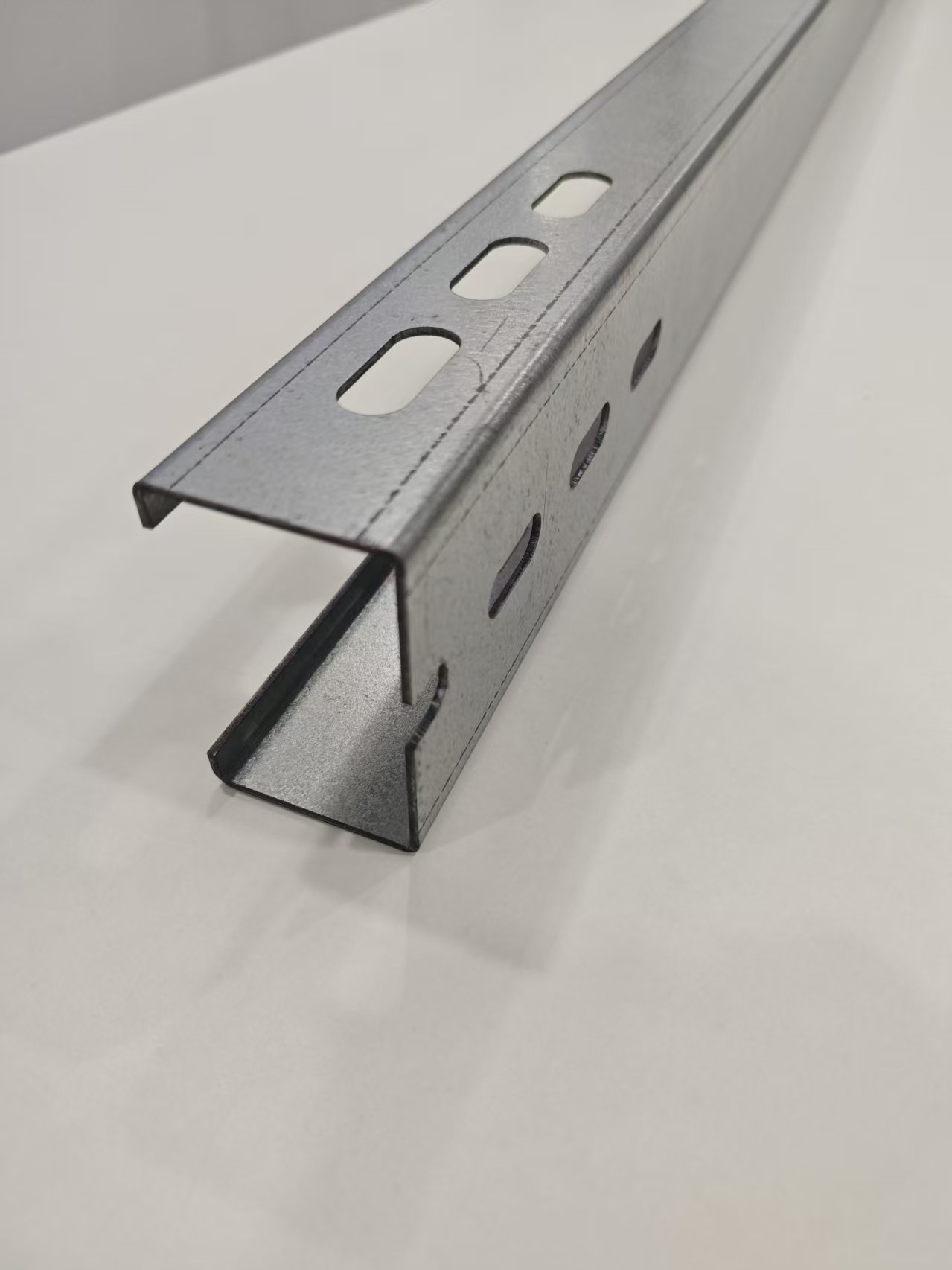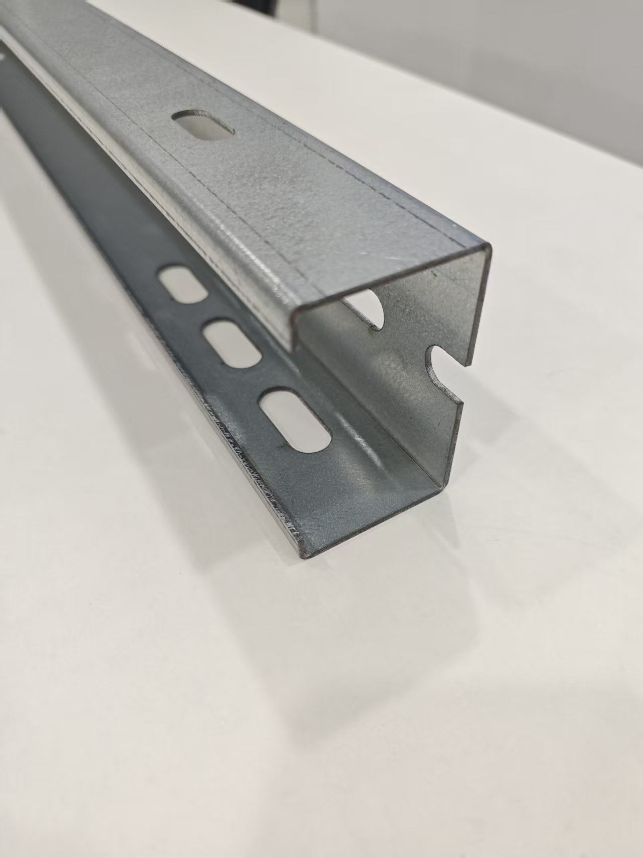รางเหล็กโซลาร์ชนิด C มีสามหน้าและหนึ่งช่องเปิด โดยมีขอบสองช่องที่ช่องเปิดซึ่งสามารถปรับแต่งความยาวได้ หน้าตรงข้ามช่องเปิดจะมีรูที่ปลายรางทั้งสองข้างทำให้สามารถเชื่อมต่อกับเสาได้หลากหลายรูปแบบ ใบหน้าที่เหมือนกันอีกสองหน้าทำหน้าที่เป็นด้านบนและด้านล่าง โดยมีรูปแบบรูที่ออกแบบมาเพื่อเชื่อมต่อกับเสา คาน หรืออุปกรณ์เสริมอื่นๆ โดยรวมแล้ว นี่ถือเป็นเส้นทางที่ใช้กันอย่างแพร่หลายที่สุดในระบบสนับสนุน